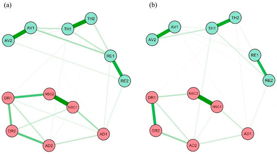 CPTSD symptom networks for men (a) and women (b). Notes: RE1: nightmares; RE2: flashbacks; AV1: internal avoidance; AV2: external avoidance; TH1: hypervigilance; TH2: exaggerated startle response; AD1: long-term upset; AD2: emotional numbing; NSC1: feelings of failure; NSC2: feelings of worthlessness; DR1: feeling distant or cut off from others; DR2: difficulties feeling close to others.