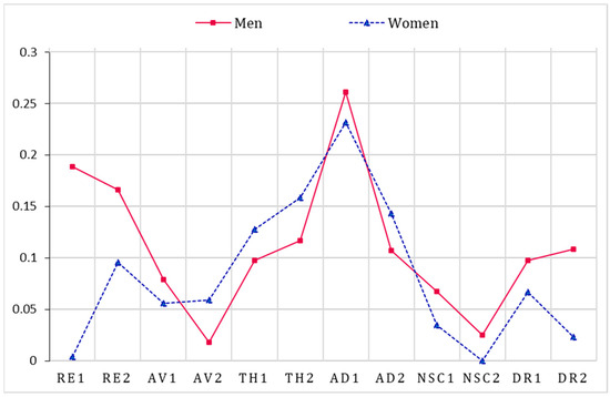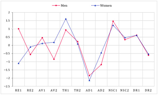 Standardized strength centrality in men and women samples. Notes: RE1: nightmares; RE2: flashbacks; AV1: internal avoidance; AV2: external avoidance; TH1: hypervigilance; TH2: exaggerated startle response; AD1: long-term upset; AD2: emotional numbing; NSC1: feelings of failure; NSC2: feelings of worthlessness; DR1: feeling distant or cut off from others; DR2: difficulties feeling close to others.