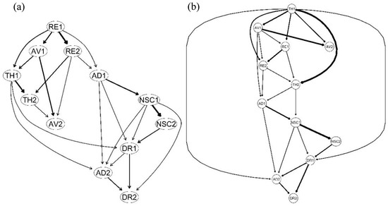 Directed acyclic graphs of men (a) and women (b). Notes: RE1: nightmares; RE2: flashbacks; AV1: internal avoidance; AV2: external avoidance; TH1: hypervigilance; TH2: exaggerated startle response; AD1: long-term upset; AD2: emotional numbing; NSC1: feelings of failure; NSC2: feelings of worthlessness; DR1: feeling distant or cut off from others; DR2: difficulties feeling close to others.