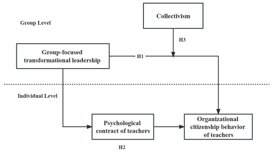 Moreover, organizational citizenship behavior possesses certain social attributes [82]. The interpersonal ambiance and relational status within a group are often considered significant determinants of organizational citizenship behavior [83]. Group-focused transformational leadership accentuates communication and cooperation among members of teacher groups [64]. It focuses on the creation of a supportive, relaxed, and trustful environment within the teacher groups, fostering positive interpersonal interactions and relationships, and subsequently encouraging more organizational citizenship behavior among individual teachers [84]. Thus, based on the above analysis, this study proposes the following hypothesis: