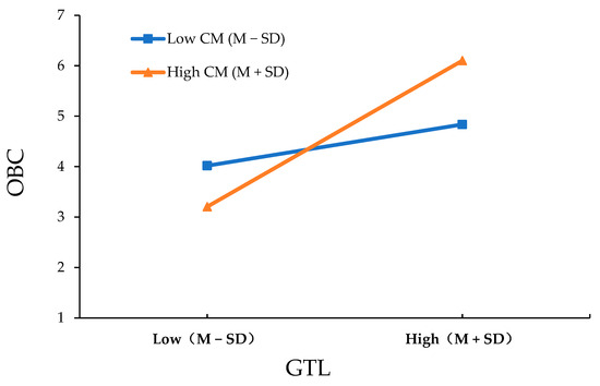 According to the concept of leader–follower value congruence [71], when subordinates’ values align with the leadership style in terms of ideology, subordinates are more likely to respond strongly to that leadership style, whereas the influence of this leadership style on subordinates is comparatively weaker when there is a divergence in values. Group-focused transformational leadership places importance on collective awareness and group objectives [72], encouraging group members to collaborate synergistically for the attainment of common goals [73]. Group members with a high degree of group collectivism tend to adhere to collective norms, prioritize group objectives, and actively participate in cooperative endeavors [74]. This alignment corresponds with the ideology of group-focused transformational leadership. Consequently, group members immersed in a high-level group collectivist atmosphere are more likely to internalize the leadership’s group values, leading to a manifestation of organizational citizenship behavior [75]. Conversely, group members in a low-level group collectivist atmosphere hold self-centered values [42], which can be viewed as incongruent with the ideology of group-focused transformational leadership. As a result, for such employees, the impact of group-focused transformational leadership on organizational citizenship behavior might be relatively weaker.