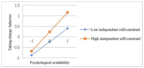 Independent self-construal positively moderates the relationship between psychological availability and employees’ taking-charge behavior. That is, the higher the independent self-construal, the stronger the positive impact of psychological availability on employees’ taking-charge behavior.