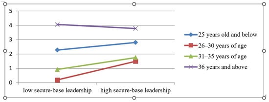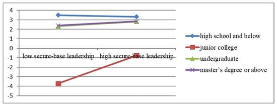 The present study further tests the potential moderation effect of gender, age, education level, and tenure. The results indicate that the effect of gender (p = 0.1452) and tenure (p = 0.3181) did not reach statistical significance. Age significantly moderates the effect of secure-base leadership on taking-charge behavior (p = 0.0442, p < 0.05), which is vividly depicted in Figure 3. Among the four age groups, the slope represented by the 26–30 years of age is the highest, indicating that effect of secure-base leadership on such behavior achieves the optional. As shown in Figure 4, education level also has a significant outcome in their relationship (p = 0.000). For the education categories, the slope of the junior college possesses the highest value, suggesting employees attaining junior education have the highest possibility to take charge behaviors with the influence of secure-base leadership.