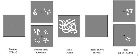 To this end, the current study examined both the capacity limit and the time limit of ensemble representations in working memory. Previous studies have primarily focused on investigating the capacity limit of spatially intermixed sets, which are collections of items defined by different colors [14,15,16,17]. In the study conducted by Halberda, Sires, and Feigenson [14], participants were presented with arrays of dots of different colors and were asked to enumerate multiple color-defined dot groups. The researchers compared the participants’ performances in the pre-cue condition, where they were informed in advance which subset to enumerate, and the post-cue condition, where they were not told until the array had disappeared. They found that participants were able to enumerate approximately two subsets, along with the superset of all dots. Since participants did not know which subset to enumerate until 500 ms after the array had disappeared on post-cue trials, enumerations needed to be held in working memory during this 500 ms, which indicates that working memory can maintain three enumerations. Similarly, Luo and Zhao [17] employed the pre-cue and post-cue paradigm to investigate the capacity limit of multiple color-defined circle groups. In their study, participants were asked to estimate the mean size of each set and the results showed that participants could accurately estimate mean sizes of up to two sets of circles. These findings suggest that the capacity of ensemble representation in working memory is limited. However, working memory has been found to have not only a capacity limit (i.e., the number of items that can be held) but also a time limit (i.e., how long items can be held before they are forgotten or displaced) [18,19,20,21]. In order to better understand the dynamics of information stored in working memory [22], both the capacity and temporal decay of ensemble representations were measured in this study.