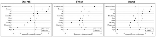 Distribution of control variables before and after matching. Note: Covariates: Edu stands for education; Ins stands for health insurance coverage; Times stands for the number of outpatient visits in a month; and Cost stands for the cost of outpatient visits in a month.