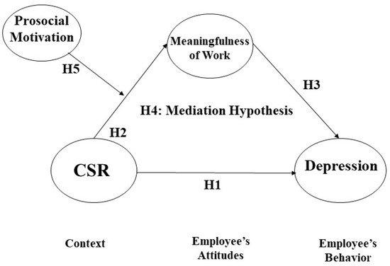 Drawing on the theoretical scaffolding provided by the preceding discussions, our argument proposes that the construct of the ‘meaningfulness of work’ experienced by employees operates as a mediating factor within the context of the impact of CSR on depression. This claim is firmly anchored in established theoretical foundations that underscore the capacity of CSR to augment the level of meaningfulness that employees perceive in their work [18,19,20].