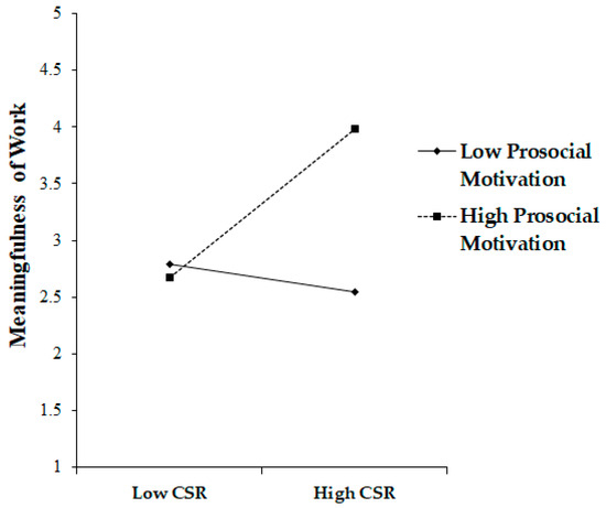 In particular, we posit that prosocial motivation can play a beneficial role as a moderating variable, which amplifies the positive effect of CSR on meaningful work. In accordance with the theory of person-organization fit [43,44,45], a synergistic dynamic may emerge when an individual’s value framework aligns with their employing organization’s values. For instance, employees displaying a strong inclination towards prosocial motivation may tend to endeavor to make a societal impact through their occupational engagements. As a result, these individuals will be more inclined to perceive an alignment between their personal values and the ethical actions taken by the organization (i.e., CSR) [25]. This alignment would lead them to react positively to the CSR activities of their organization. Then, such employees may perceive their organization’s CSR initiatives as fulfilling their ethical obligations to contribute to societal well-being [25,26,27]. Consequently, they are more likely to interpret CSR efforts favorably, experiencing an enhanced sense of meaningful work.