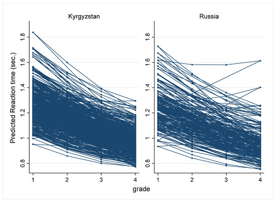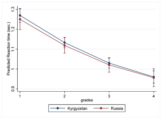 According to Table 1, the reaction time decreased over time in both samples, which implies that processing speed increased from grade 1 to grade 4. The variability in processing speed scores decreased in both analyzed samples from grade 1 to grade 4. Interestingly, although the size of the Russian sample was smaller than the size of the sample from Kyrgyzstan, the variance in reaction time was larger in the Russian sample.