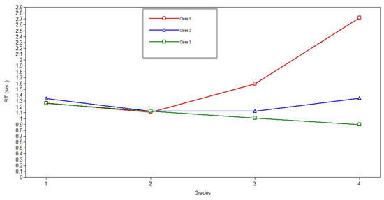 The results presented in Table 7 demonstrated that the third latent class is the most prevalent (92%). This class is characterized by a linear decrease in reaction time, indicating a steady improvement in processing speed from grade 1 to grade 4. The second latent class included 7% of the participants and was characterized by a fast growth in processing speed from grade 1 to grade 2 that subsequently slowed down significantly. The least numerous first latent class included only 1% of the participants, who demonstrated a medium growth of processing speed from grade 1 to grade 2 and a further decrease in processing speed (increase in reaction time) afterward. Since this class consisted of only a few cases, it can be considered an outlier.