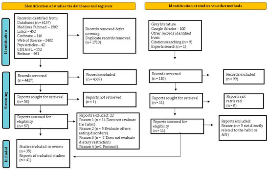 A limited search was initially performed in Medline/PubMed to identify potentially relevant documents. At this stage, the terms “habit”, “anorexia nervosa”, and “food restriction” were identified in the titles, abstracts, and keywords of the recovered documents. Finally, all terms and their synonyms were selected from Medical Subject Headings (MESH), Embase Subject Headings (Emtree), Health Sciences Descriptors (DeSC), and the APA Thesaurus of Psychological Index Terms and included: “Anorexia Nervosa” OR “Anorexia Nervosas” OR “Atypical Anorexia nervosa” AND “Habits” OR “Habit*” OR “Habit Disturbances” OR “Habit Disturbance” OR “Learned habit” OR “Conditioned habit” OR “Habitual behavior” OR “Habit systems” OR “Habit strength” OR “Habit formation” OR “eating habits” OR “Food restriction” OR “Food refusal” OR “Dietary restraint” OR “Dieting”. They were then added to the search strategy to be applied in all databases using the Boolean operators “AND” and “OR”. The strategy can be found in the Supplementary Materials Archive S2. The online software EndNote classic version https://endnote.com/ (accessed on 19 August 2022), a reference manager, was used to remove duplicates.