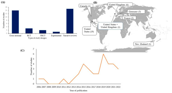The description of the main characteristics of the 35 studies included in this review is summarised in Tables S2 and S3 (Supplementary Material S3). Among them, 20 were empirical studies (randomised clinical trials [RCTs] and non-randomised clinical trials [NRCTs], experimental, cross-sectional, and longitudinal studies) and 15 were reviews. Regarding the distribution of studies around the world, the highest number was identified in the USA (n = 19), followed by the United Kingdom (n = 6), Germany (n = 5), France (n = 2), New Zealand, and Canada (n = 1 in each country). One study (Godier et al. [15], study 1 and study 2) was developed in the United States and the United Kingdom. According to the broader bibliometric research trends, the first study, published in 2006, was a narrative review [19], followed by a substantial chronological increase in publications, especially from 2018 to 2021 (Figure 2).
