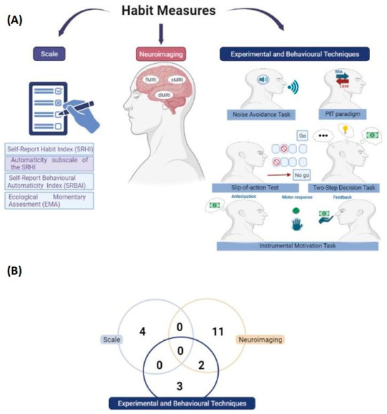 Measures to evaluate habit-related food restriction in AN. Types of methods used to assess the habit (A) and the number of studies according to the habit assessment measure (B). Created with BioRender.com, accessed on 5 September 2023.