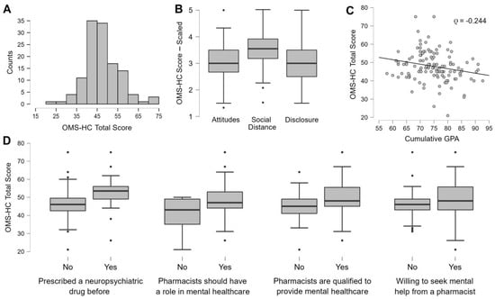 The mean total stigma score obtained via the OMS-HC was 47.9, in which the social distance domain had the highest mean score followed by the disclosure and attitudes domains. Nonetheless, the stigma score was independent from all demographics except for GPA, which had a negative correlation. When compared to other populations in previous studies that adopted the 15-item OMS-HC, the results indicate a relatively high stigmatizing behavior among the study subjects. For instance, in the work of Douglass and Moy (2019) evaluating the impact of a social media-focused intervention on mental health stigma among a university sample of pharmacy students in the United States, both pre- and post-intervention scores (36.8 and 35.1, respectively) are markedly lower compared to the current results []. Among working pharmacists in Accra, the overall score was 37, which is also significantly lower in comparison to the current findings []. This can also be observed among other populations from different domains, such as medical students in Saudi Arabia [], nursing students in Australia [], and other primary healthcare providers in Bahrain and Chile [,]. In all of the aforementioned studies that used the OMS-HC, and consistent with the findings herein, there was no statistically significant influence of gender on the stigma scores of the participants. However, in other studies that used different stigma assessment tools, the results differed in terms of gender impact on stigma towards mental illness, as some studies reported the existence of a gender impact [,], while others reported no influence [,]. The assessment and/or inclusion of other demographics (i.e., nationality, marital status, etc.) varied considerably in the literature [,,,,], and, therefore, this calls for further large-scale studies to assess their potential influence.