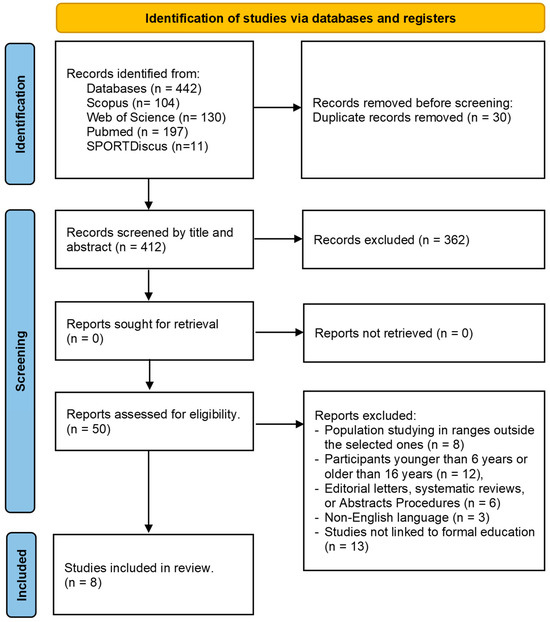Based on a systematic review of the literature specifically addressing nautical activities and formal education, following the guidelines proposed by Tricco et al. [37] regarding the inclusion of empirical, conceptual, and peer-reviewed papers, a total of 442 articles were initially identified. Among these, 30 duplicates were identified and subsequently removed. Further evaluation of titles and abstracts led to the exclusion of an additional 363 articles. As a result, 50 articles remained for a detailed review of the full text. After applying the aforementioned exclusion criteria, a total of 8 articles met all the specified criteria.