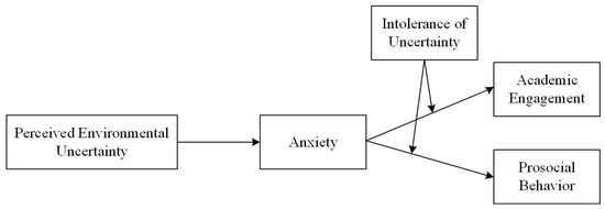 In the current VUCA era, university students continue to face a highly uncertain environment characterized by volatility, uncertainty, complexity, and ambiguity. Individuals who perceive higher levels of environmental uncertainty tend to experience higher levels of anxiety [16]. Conversely, individuals who perceive lower levels of environmental uncertainty are less likely to be disturbed or influenced, resulting in lower levels of anxiety. In addition, anxiety can negatively affect students’ academic engagement and prosocial behavior. The more anxious students are, the less likely they are to engage in academic and prosocial activities. Therefore, university students’ perceptions of environmental uncertainty result in an increase in anxiety, which subsequently leads to a decrease in academic engagement and prosocial behavior. Thus, we propose the following: