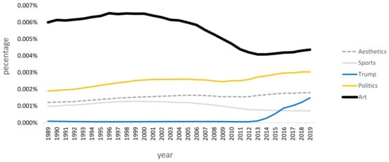 Our present world is dominated by aesthetics—you will literally find aesthetic considerations everywhere. People take care of their outward appearance, consumers buy aesthetically pleasing food [23] and consumer products such as cars or smartphones [24], and homes, houses, and museums are trended towards appreciated aesthetics [25]. When looking at Google Ngram based on the English-19 corpus [26], it is obvious that aesthetics plays a strong role, it even outperforms sports and topics around “Trump”, reaching nearly the same level of attention as politics in the retrieved literature. Beyond mere aesthetics, references to art are even more often found in the literature; see Figure 1.