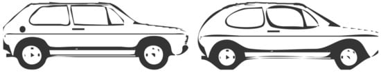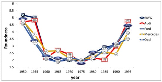 Although our individual taste might be relatively stable, indicated by quite high retest reliabilities, as indicated before, we experience an ongoing change of what we like over time [31]. This is evident with fashion, where we rely on the fashion concepts of our current Zeitgeist. It is also evident that we cannot freely select among all possible designs due to a lack of offering possibilities—the market is, strictly speaking, limited to typical Zeitgeist trends, or at least it takes much more effort to find designs deviating from the current fashion trend, e.g., flare jeans in times when peg-top jeans are fashionable. Based on evolutionary universal preference theories, it is often assumed that round forms are preferred to more angular forms due to safety and pleasantness associations deeply rooted in our minds [4]. Such cycles of preferences for specific shapes dependent on Zeitgeist effects could be empirically revealed for the domain of car designs [26], where round forms dominated only in specific times, such as the 1950s and 2000s—see Figure 2.