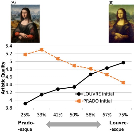 These Zeitgeist effects are often culturally modulated, and it seems that even big, independent organizations such as car companies synchronize with each other regarding the usage of specific Zeitgeist-dependent properties and qualities. However, also, on the individual level we can see drastic changes even over very short periods of time [37]. The idea that we are only bound to cultural context and social pressure [38] seems to be shortsighted. Actually, we undergo very fast transformations in liking and aesthetic evaluation due to adaptation effects. They happen quickly and sustainably [39] and have the power to substantially change mental representations and their evaluations, even if widely known, strongly represented, and reliably recognizable aesthetic items such as Leonardo’s Mona Lisa are used as target material [40]. When confronted with the alternative depiction of the Mona Lisa, the second version from Leonardo’s studio [41], now owned by the Prado Museum in Madrid, people typically react very negatively—they disapprove of this version, primarily due to its (original) colorfulness which is typical for Leonardo’s painting style and which the Louvre version is nowadays lacking due to its yellowed varnish. People are so accustomed to the yellowish-brownish color tones of the Louvre version with hardly any original color spectrum any longer visible that they reject all other versions, especially if they intensively use colors. This general and strong attitude can be modulated quickly and easily by letting participants elaborate the alternative, colorful Prado version. After having inspected the Prado version for just 10 min and reporting about different properties of this version, they showed an entirely different attitude pattern [40]: the more Prado-esque the version was (a morphing technique generated gradual intermediate versions between the Prado and the Louvre version), the higher the artistic quality. We revealed opposite effects when the Louvre version had to be initially considered; then, the participants evaluated the artistic quality more highly, the more Louvre-esque the version was (see Figure 4).