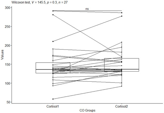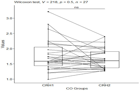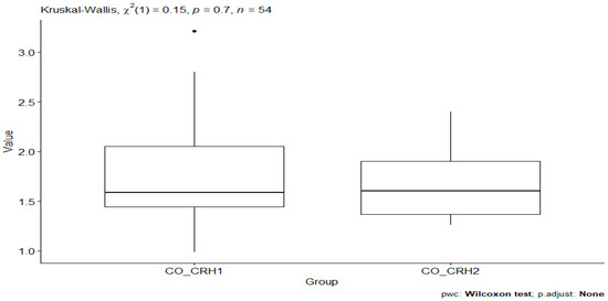 However, comparing the CO_CRH1 (CRH value in the control group before testing) and CO_CRH2 (CRH value in the control group after testing) groups, no statistical significance was observed between the groups’ p-value = 0.7. (Figure 2).