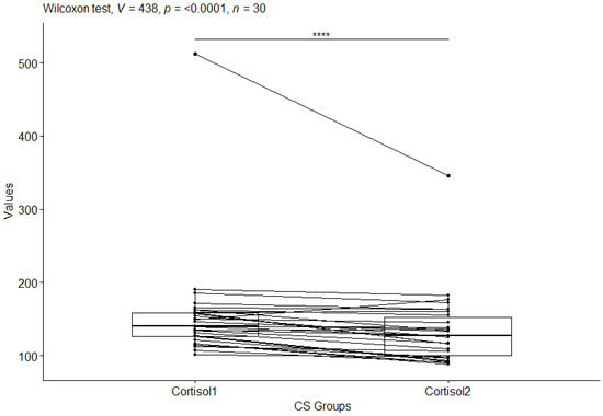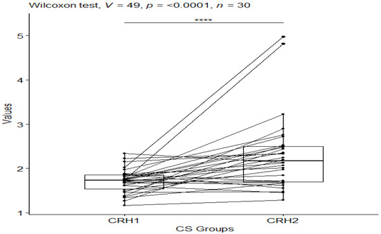 The Wilcoxon test was also applied to check which groups differed statistically significantly for the CS group before and after testing, and for the CO group before and after testing for CRH (corticotropin-releasing hormone) values. For the CRH values in the CS group, a statistical significance of p-value ≤ 0.0001 was observed (Figure 5), while no statistical significance of p-value = 0.5 was observed in the control group (Figure 6).