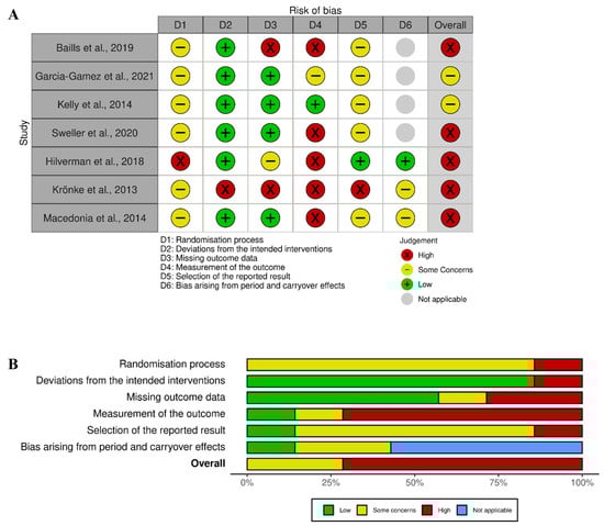 Figure 2. Results of the risk of bias assessment for studies included in the meta-analysis [14,55,56,58,88,89,90], displayed with a traffic light plot for each individual study (panel A), and a summary plot (panel B). Risk of bias was evaluated with the RoB 2 (first four studies) and RoB 2 for crossover trials (last three studies) tools [76].