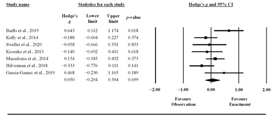 Figure 3. Forest plot showing the differences between observation and enactment of gestures on recall tasks (free and cued recall, and object identification tasks are combined) [14,55,56,58,88,89,90].