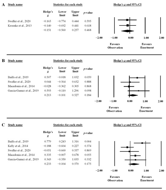 Figure 4. Forest plots showing the differences between observation and enactment of gestures on free recall performance (panel A), cued L1–L2 recall (panel B), and cued L2–L1 recall (panel C) [14,55,56,58,88,89,90].