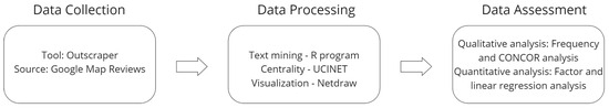 There has been a long tradition of carrying out customer satisfaction research using surveys and questionnaires as the dominant method of gathering data in the past [40]. Researchers have utilized a range of techniques for conducting sentiment analysis, among them the application of the R language and the RStudio software package [41], RStudio serves as a comprehensive integrated development environment for R programming, offering optimization specifically tailored for statistical computing purposes. UCINET is primarily used in social science research for analyzing network relationships. In the hospitality industry, UCINET is frequently used for sentiment analysis, since it is a reliable and widely used tool [42]. Semantic network analysis delves into the fundamental semantic structure of information by scrutinizing the interconnections between word frequencies and their sequential placement within sentences. In contrast to other forms of analysis, semantic network analysis does not assign specific meaning to the words studied [43].
