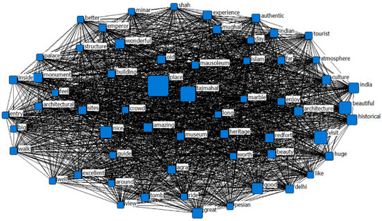 A high frequency of appearance in the customer reviews can be seen in Table 3. Words such as “place”, “tajmahal”, “visit”, “beautiful”, and “nice” were mentioned. In particular, the word “place” was mentioned 2072 times, “tajmahal” 1312 times, and “visit” 987 times. Figure 2 illustrates the interconnectedness between these words through the use of a network containing the most frequently used words.