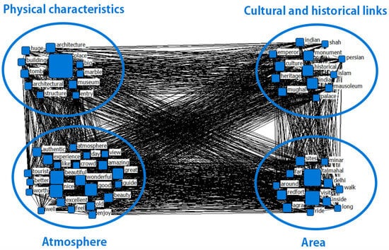 The last cluster is named “area”, since it contains many words that are related to location in India, such as “visit”, “redfort”, “India”, “agra”, “delhi”, etc. These words also exhibit a relatively high frequency in the context of the reviews (e.g., “tajmahal” was used 312 times, “visit” was used 9875 times). Customer reviews featured the following expressions: “Visiting India was a dream come true for me, and exploring the country’s rich heritage sites like the Red Fort, Agra, and Delhi was truly an amazing experience.”, “The Taj Mahal, in particular, was breathtaking, and walking around its intricate structure and marveling at its beauty was an unforgettable moment.”, “Although the sites can be quite far apart and require a long walk or ride to reach, the journey is definitely worth it.”, etc.
