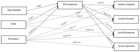 Perfectionism, self-compassion, and psychological distress: standardized path coefficients. Note. Dashed lines represent direct effects between X (perfectionism) and Y (psychological distress). Covariances between the three dimensions of X (perfectionism) are not depicted. * p < 0.05, ** p < 0.01, *** p < 0.001.