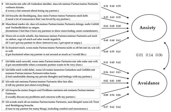 As argued above, 11 items of the ECR-G-36 had the problematic wording “partners” and “a partner” (1, 3, 9, 12, 13, 21, 23, 29, 31, 32, 34). (It should be noted that “romantic partner(s)” was also translated to “my partner” in the German version because there is no term in German that exactly corresponds with this American term.) In the following analyses, an item selection was considered that no longer contained these 11 items, but consisted of the 25 items without the problematic formulation mentioned above.