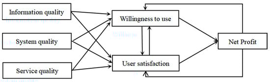 The theory of information system success, which was initially proposed by DeLone and McLean (1992), states that information quality and system quality jointly affect users’ satisfaction with and intention to continue using the system, and satisfaction significantly affects consumers’ willingness to use the system [12]. After 2003, and based on the previous increases in the quality of service, the variables that enhance the universality and practicability of the model used, including the information quality, system quality, and service quality, affect the degree of satisfaction, which affects use intention [13]. The information system success model is also known as the D&M model, in which the information quality comprises a clear statement expression, complete system content, security, relevance, and innovation, and it is easy to understand. To measure the system’s quality, there are indicators, such as usefulness, reliability, responsiveness, etc., to judge whether a system is successfully designed. The indicators that are used to measure service quality include response timeliness, assurance, empathy, etc. High-quality service can contribute to customer retention and improve performance. The D&M model is shown in Figure 1.