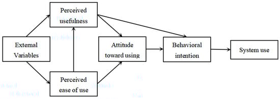 The technology acceptance model was proposed by Davis (1989) when he used the rational behavior theory to study users’ acceptance of information systems [18]. It was initially used to conduct extensive research on users’ acceptance behavior regarding information systems. The technology acceptance model proposes two main determinants: perceived usefulness and ease of use. Figure 2 shows the technical acceptance model.