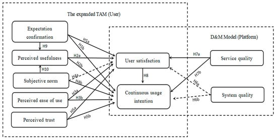 The TAM is an extension of the rational behavior theory, and subjective norms originate from this theory. Therefore, it is reasonable to introduce subjective norms as an external variable in the TAM [26]. Subjective norms determine the behavioral intention [33,34]. The expanded TAM is widely applied, and in the research on behavior intentions in areas such as education [28] and online shopping [9,35], subjective norms have demonstrated their influence. Perceived trust is also an essential factor that can extend the TAM [36]. For example, a dimension of perceived trust can be added to the TAM to better explain users’ acceptance of new technology. In this way, the TAM can provide a more comprehensive explanation of user behaviors and better predict the adoption and diffusion of new technology. In recent years, based on the technology acceptance model, more and more scholars have incorporated trust into it and expanded the TAM, especially in e-commerce [16,23,24]. Expectation confirmation refers to whether the effects after using the platform meet the expectations before use, which is closely related to the continuous use intention. Many studies have introduced this variable for expansion. Bhattacherjee constructed an innovative model, combining expectation validation with perceived usefulness [37]. Brown used polynomial modeling and a response surface analysis to study expectation validation in information systems using technology acceptance models [20]. Malik and Singh integrated the expectation confirmation theory into the technology acceptance model [38]. This combination realizes the integration of expectation validation and the technology acceptance model and obtains a broader range of continuous use model information systems.