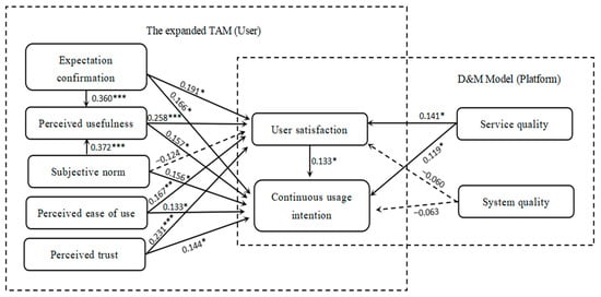 Based on the D&M model and the expanded TAM, this paper carries out model innovation. This approach combines both the consumers’ and platform’s perspectives, making the article’s research more comprehensive. The innovative model of this article is shown in Figure 3. The application fields include social platforms, online learning, e-commerce, e-government, mobile search, etc.