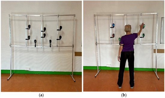 The WLS tests were performed with Witty SEM, with a set of eight 5 cm × 7 cm semaphores equipped with an LED matrix—on which various colors and shapes can be displayed. Witty semaphores were placed individually (2 in the center and 6 in the periphery) on a specially designed rack (Figure 1). The tests were initiated by a wireless control panel operated by radio transmission. The Witty Manager software enables the researchers to create new tests and record and save collected results. Three tests were designed. For each test, the participant stood in the middle of the rack, and at arm’s length from the semaphores. They had to turn off the lights that appeared as fast as possible, using their dominant hand, without moving their feet, and returning their hand to the middle of their hips between each repetition. Witty semaphores include a motor sensor; it is thus necessary to approach it to turn it off. For each test, a trial with 5 examples was carried out.