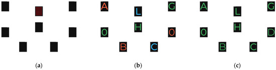 This test is separated into 3 parts. In the first part (Figure 2a), Reaction Time (RT), the participant had to turn off the semaphores that randomly lit up red as fast as possible. The others remained unlit. In the second part (Figure 2b), Reaction Time with Simple Inhibition (SI), the participant had to turn off the randomly lit semaphores with the green letter O as fast as possible. The others lit up with other colors (i.e., blue, red) associated with a letter (i.e., A, B, C, D, E, F, G, H). In the last part (Figure 2c), Reaction Time with Complex Inhibition (CI), the participant had to turn off the randomly lit semaphores with the green letter O as fast as possible. The others lit up in green, associated with another letter (i.e., A, B, C, D, E, F, G, H). Each part consisted of 20 trials; each trial started 1500 ms after the previous response. The total time to complete each part was recorded in milliseconds. Inhibition was highlighted by analyzing the time difference in the CI–RT result.