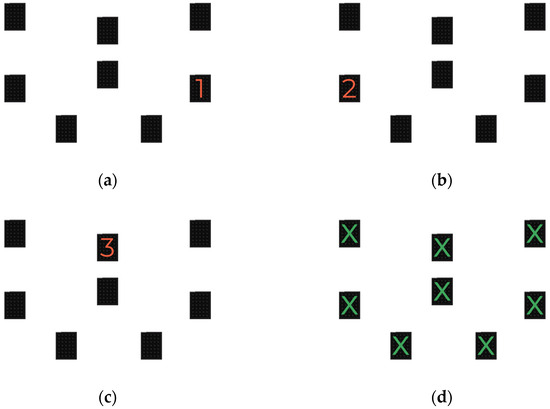 In the first part, which assesses visuospatial short-term memory, an ascending numerical sequence (e.g., 1, 2, 3, 4) was displayed thanks to the semaphores that lit up one after the other at the rate of one per second (Figure 3a–c). When all semaphores showed a green dot (Figure 3d) at the end of the sequence, the participant had to indicate the sequence of the numbers in the same order. In the second part, which assesses visuospatial working memory, a descending numerical sequence (e.g., 4, 3, 2, 1) was displayed thanks to the semaphores that lit up one after the other, at the rate of one per second. When the semaphores showed a green dot at the end of the sequence, the participant had to indicate the sequence of the numbers in the reverse order. For each part, the tests started with a sequence of 2 numbers. An additional number was added to the series for every two successful attempts. One point was awarded for each successful attempt, with 10 attempts.