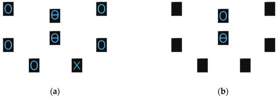 On the central semaphores A and B, the participant was shown a symbol—which was the same for both semaphores—corresponding to two icons (“circle with a horizontal line” or “the circle with a vertical line”). The participant had to remember this symbol. In addition, a symbol appeared (a blue cross) on one of the other peripheral semaphores, while other symbols appeared (a blue circle) on the other peripheral semaphores (Figure 4a). The participant had to remember the location of the cross. All information remained displayed for 1.995 s.