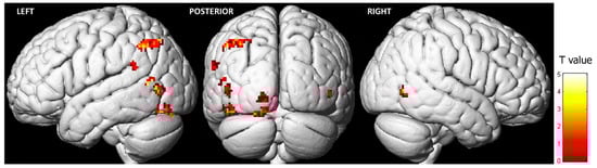 Observing pain expressions led to heightened activity in specific regions of the frontal, temporal, and parietal lobes (Table 1; Figure 2). The most significant cluster of activation (FWE < 0.05) was in the left inferior parietal lobule (IPL). Additionally, key clusters of activation in the occipital lobe were found in the left middle occipital gyrus (MOG) and the left lingual gyrus (LG). Lastly, the primary cluster of activity in the temporal lobe was situated in the left superior temporal gyrus (STG). In the right hemisphere, higher activity was observed exclusively in the right middle temporal gyrus (MTG) during the observation of pain expressions. Conversely, the opposite contrast (i.e., control condition > pain expression faces) did not reveal any differences.