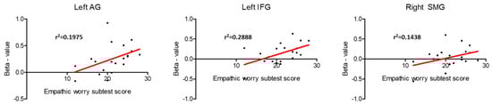 ROI analysis in the core regions of the sensorimotor MNS was also conducted in the regression analysis (Supplementary Tables S1 and S2). A positive association between brain activity during pain expression observation and EC subscale results was detected in the left AG (t = 3.35, corr-p = 0.033), the left IFG (t = 3.28, corr-p = 0.037), and the right SMG (t = 3.40, corr-p = 0.030) (Figure 5). No other connections were found between brain activity during the observation of pain facial expressions and the remaining IRI subscales in the MNS regions (Supplementary Tables S1 and S2).