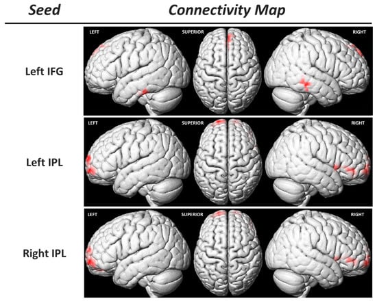 Functional connectivity (FC) analysis using the seed-to-voxel approach. The region of interest that constitutes the seed is indicated in the left column, and each FC map is in the right one (corrected p-value = 0.05). IFG: inferior frontal gyrus; IPL: inferior parietal lobule.