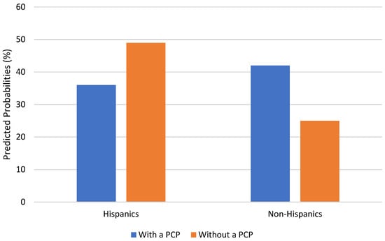 Table 2 presents the findings from the multivariate logistic regression analysis. Model 1, where race/ethnicity and healthcare provider were added as independent predictors, shows no significant effects related to race and ethnicity. Model 1 shows that those with a PCP were almost twice as likely to discuss their memory decline with a healthcare provider (OR = 1.98, p < 0.001). Models 2 and 3 added interaction terms between each race/ethnicity group and having a PCP. There was a significant interaction effect between Hispanic ethnicity and having a PCP (OR = 0.25, p < 0.05). The test of the interaction coefficient was significant (F = 4.65, p = 0.03). As graphically depicted in Figure 1, while non-Hispanic respondents who had a PCP had a higher probability of discussing memory issues with a healthcare provider (42% vs. 25%), Hispanic respondents with a PCP were less likely to discuss their memory loss with a healthcare provider (36% vs. 49%). The other multiplicative term (PCP x non-Hispanic Black) was not significant.