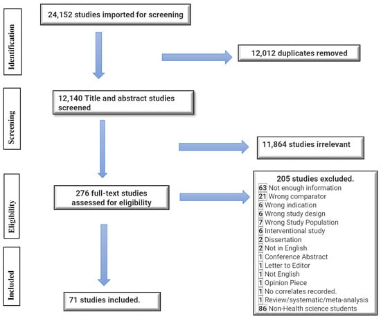 Studies were deemed eligible for inclusion in this scoping review if they addressed the prevalence and correlates of depression or anxiety among health science students. The search was limited to English language original studies, peer-reviewed quantitative articles, and studies in which study participants were not tertiary, university, college, or medical students. Papers were also excluded if they were case reports, meta-analyses, systematic reviews, interventional studies or outcomes, commentaries, editorials, opinion pieces, or grey literature, including graduate student theses, non-peer-reviewed studies, non-research articles or conference reports or opinion pieces, commentaries, and editorials. The search was limited by publication year, from 2017 to 2022. This 6-year timeframe was selected to provide a contemporary overview of recent evidence while ensuring a sufficient volume of literature to map key prevalence and correlates. Two researchers independently reviewed citations during the title, abstract screening, and full-text review phases, and conflict was resolved through discussion and consensus. A total of 276 articles were initially identified for full-text review. After a thorough assessment, 205 articles were excluded, including 86 non health science students leaving a final selection of 71 articles for the comprehensive review. The PRISMA flow diagram summarizes this information in detail (Figure 1).