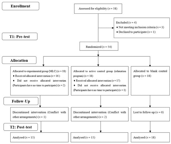 The participants in Study 2 were independently recruited and different from those in Study 1. Fifty-four postgraduate students were recruited from a Chinese university via an online advertisement, posters, websites, and text messages. The study protocol was approved by the University Committee on Human Research Protection, which is affiliated to the institution. All the participants in the study volunteered and signed informed-consent forms. After the recruitment of participants, a research student who was blind to the study design numbered the participants (number 1–54), and these numbers were randomly grouped into three groups using a random grouping tool (RANDOM.ORG). The participants were randomly assigned into three groups: (a) the experimental group (n = 18), in which the participants attended MLC; (b) the active control group (n = 18), in which the participants joined a relaxation program; and (c) the blank control group (n = 18), in which the participants did not receive any form of intervention. The flow of the participants and the study procedure are shown in Figure 1.