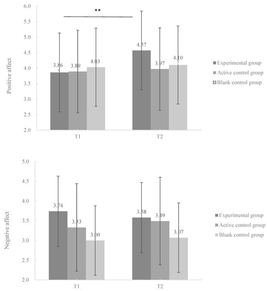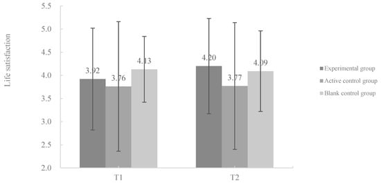 A detailed repeated-measures ANOVA was conducted on the dimensions of SWB (i.e., life satisfaction, positive affect, and negative affect). The results showed a significant main effect of time [F (1, 42) = 3.072, p = 0.057, η2 = 0.128] on positive affect, while there was no significant interaction or main effect on the other dimensions (p > 0.05). The paired-samples t-test showed that positive affect significantly improved in the experimental group after coaching (t = 4.179, p < 0.001), compared with its non-significant decrease in the active-(t = 0.507, p = 0.620) and blank control groups (t = 0.236, p = 0.816). The changes in all the SWB dimensions in the different groups from T1 to T2 are displayed in Figure 3.