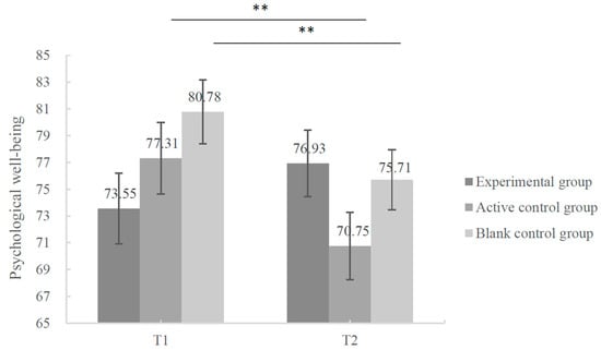 Changes in postgraduates’ SWB in different groups from baseline to post-test. Note. ** p < 0.01. The error bars represent standard errors (SE).