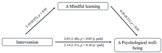 To further verify the impact of mindful learning on PWB, we programmed three groups into dummy variables (experimental group = 2, active control group= 1, blank control group = 0) and used Model 4 of PROCESS [] to conduct an analysis, with change in PWB as the dependent variable and change in mindful learning as the mediator. The results showed that the intervention had a significant influence on mindful learning (B = 3.10, t = 3.178, p = 0.003) and PWB (B = 2.653, t = 2.66, p = 0.011). When change in mindful learning was included for mediation analysis, it had a significant effect on PWB (B = 0.56, t = −2.72, p = 0.009). Change in mindful learning fully mediated the effect of intervention on PWB (see Figure 5). Therefore, the hypothesis (H4), that change in mindful learning led to the development of PWB and SWB, was partially supported after the coaching intervention.