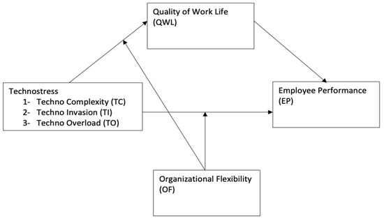 The literature has reported mixed findings related to the impact of technostress on employee outcomes. For example, AL-Ansari and Alshare [6] found significant negative effects of technostress on job satisfaction, Tarafdar et al. [7] found a negative association between technostress creator and performance, and Saidy et al. [8] found four out of five dimensions of technostress negatively influencing both in-role and extra-role performance. However, Saleem et al. [9] found a significant positive impact of technostress on the performance levels of university teachers. Technostress in the work environment is attributed to positive and negative consequences; however, research is scarce regarding the explanatory and boundary mechanisms for technostress and employee performance. With this research, we have attempted to fill this gap in the literature by empirically investigating a holistic model based on the Transactional Model of Stress and Coping while proposing quality of work life as an explanatory factor and organizational flexibility as the boundary condition.